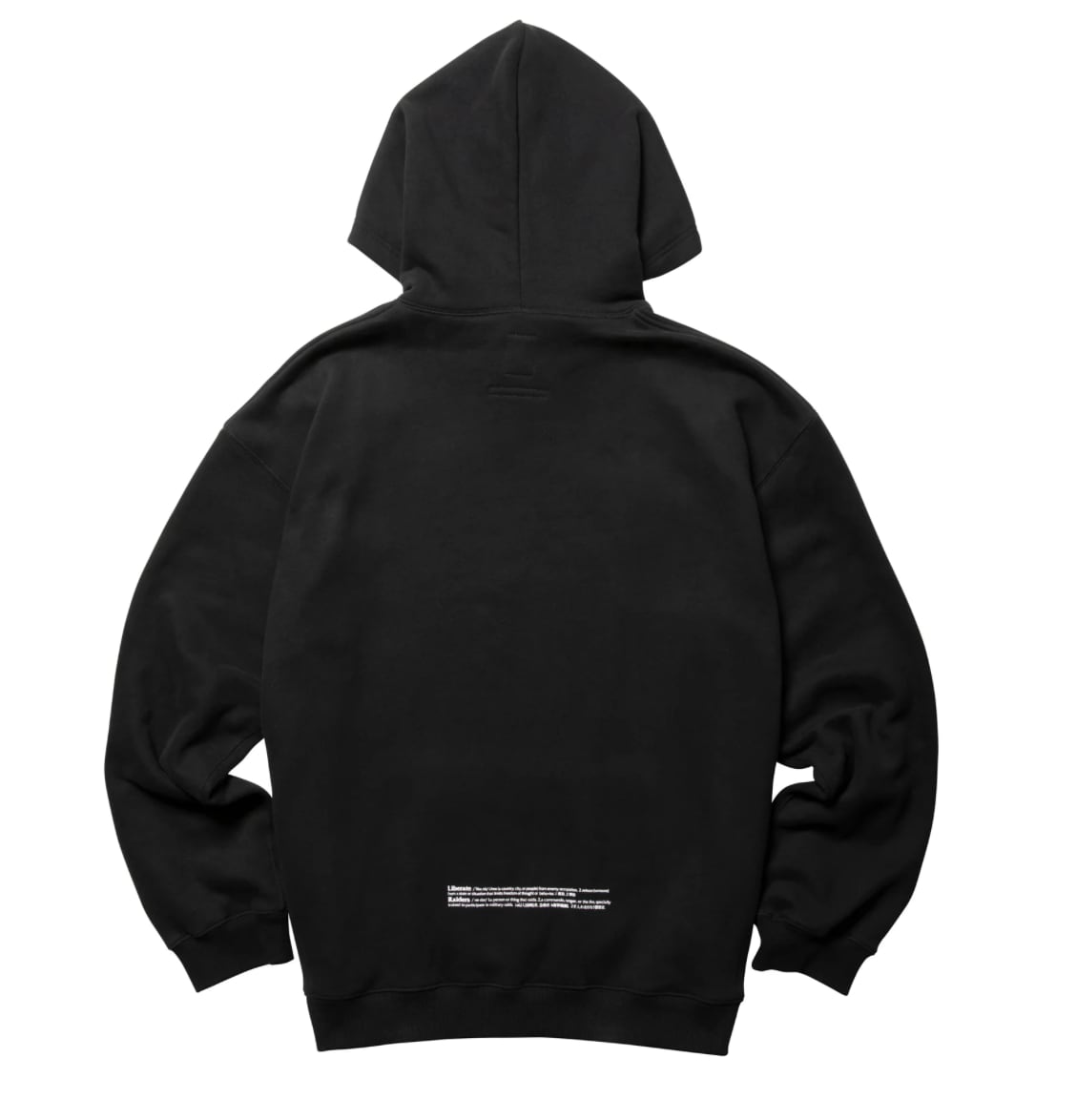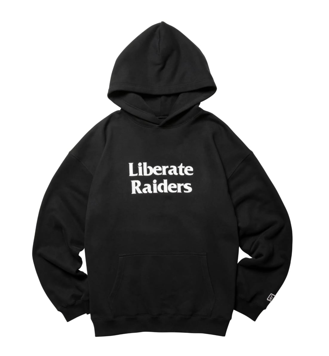 胸にブランド名の由来である【LIBERATE】=解放 と【RAIDERS】=侵略が刺繍されています。背面裾には上記の単語の説明プリントが入ります。左袖口にRロゴのワッペンが付きます