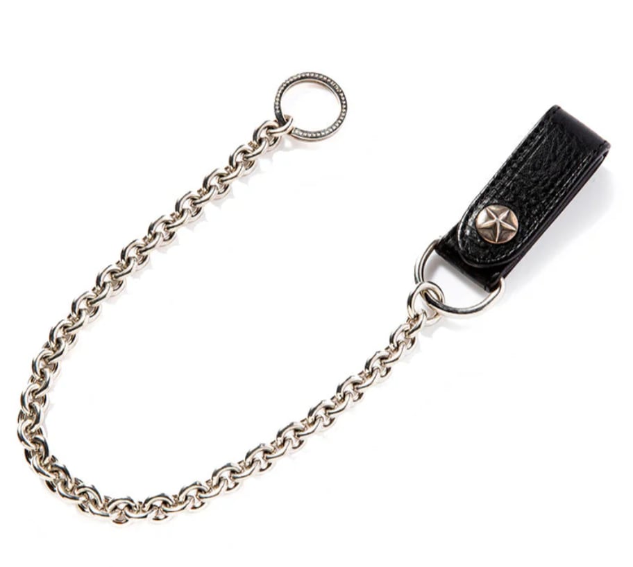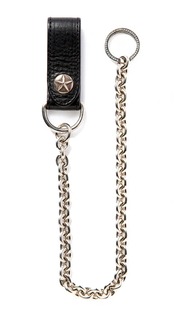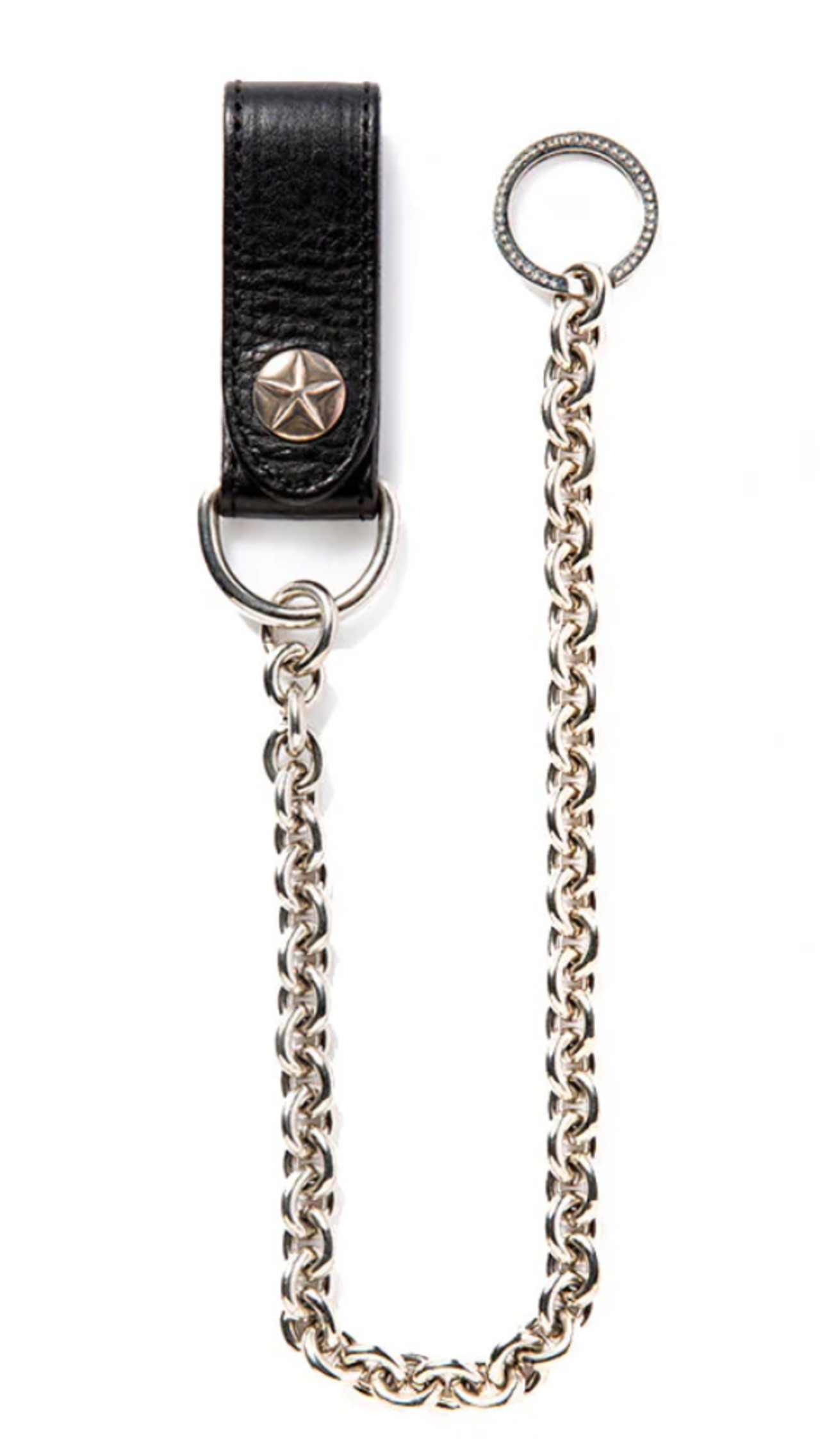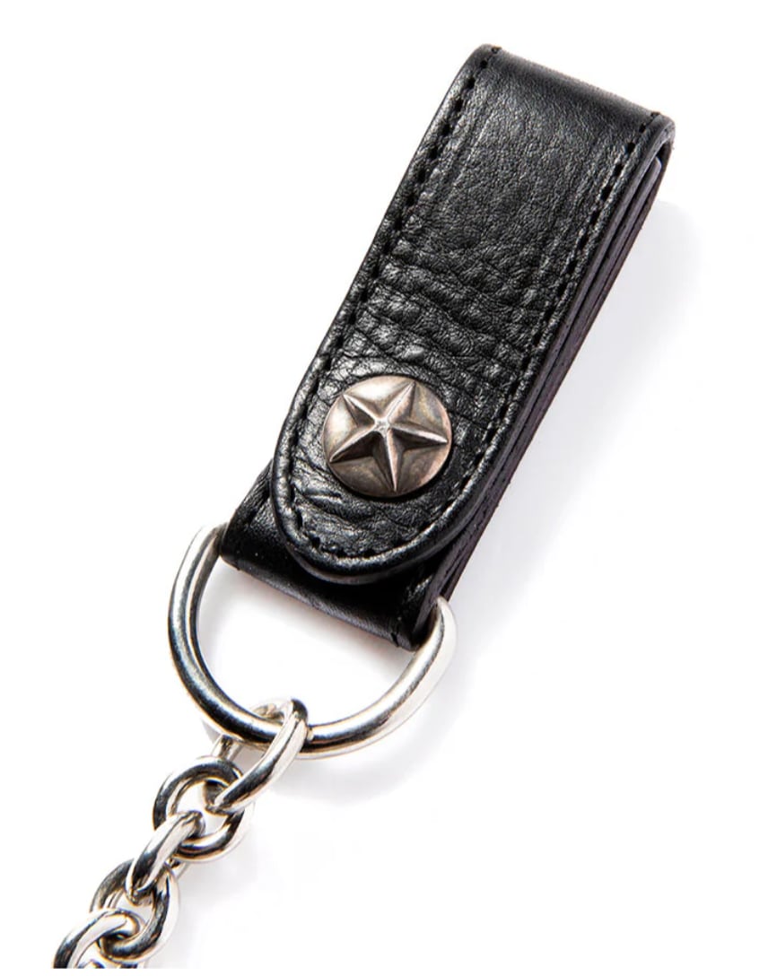 シルバーのスターコンチョスナップボタンを使用して作製されたベルト通しタイプのウォレットチェーン。レザー部分はシボ感あるレザーを採用。チェーンにはBRASSを銀メッキ加工したチェーンを使用。