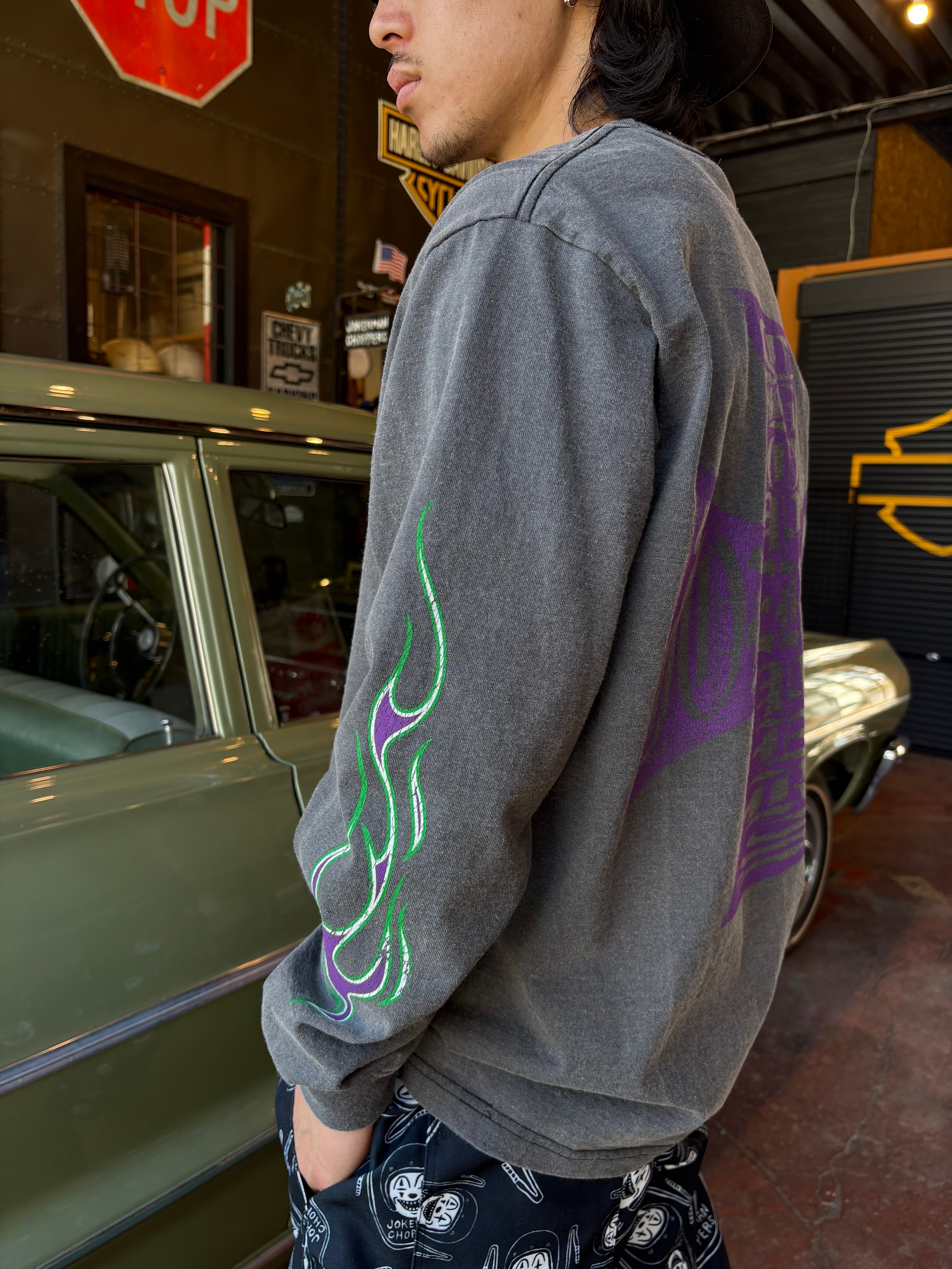 Made in USA のボディーにヴィンテージ加工を施し、JOKEMANのイメージカラーである、グリーンとパープルのフレームスと約40cmのBIG IRON CROSSをプリントしたアイテムとなります。