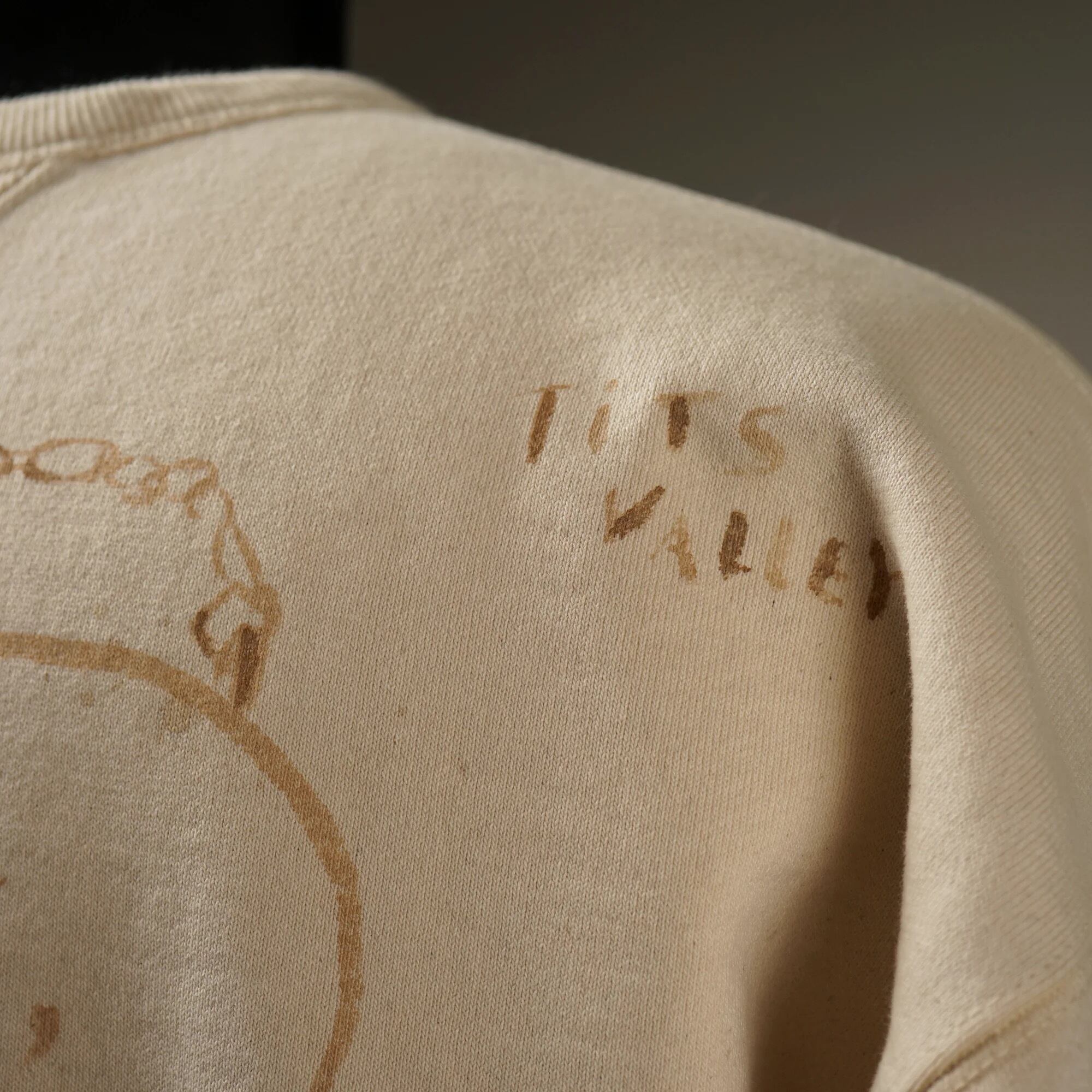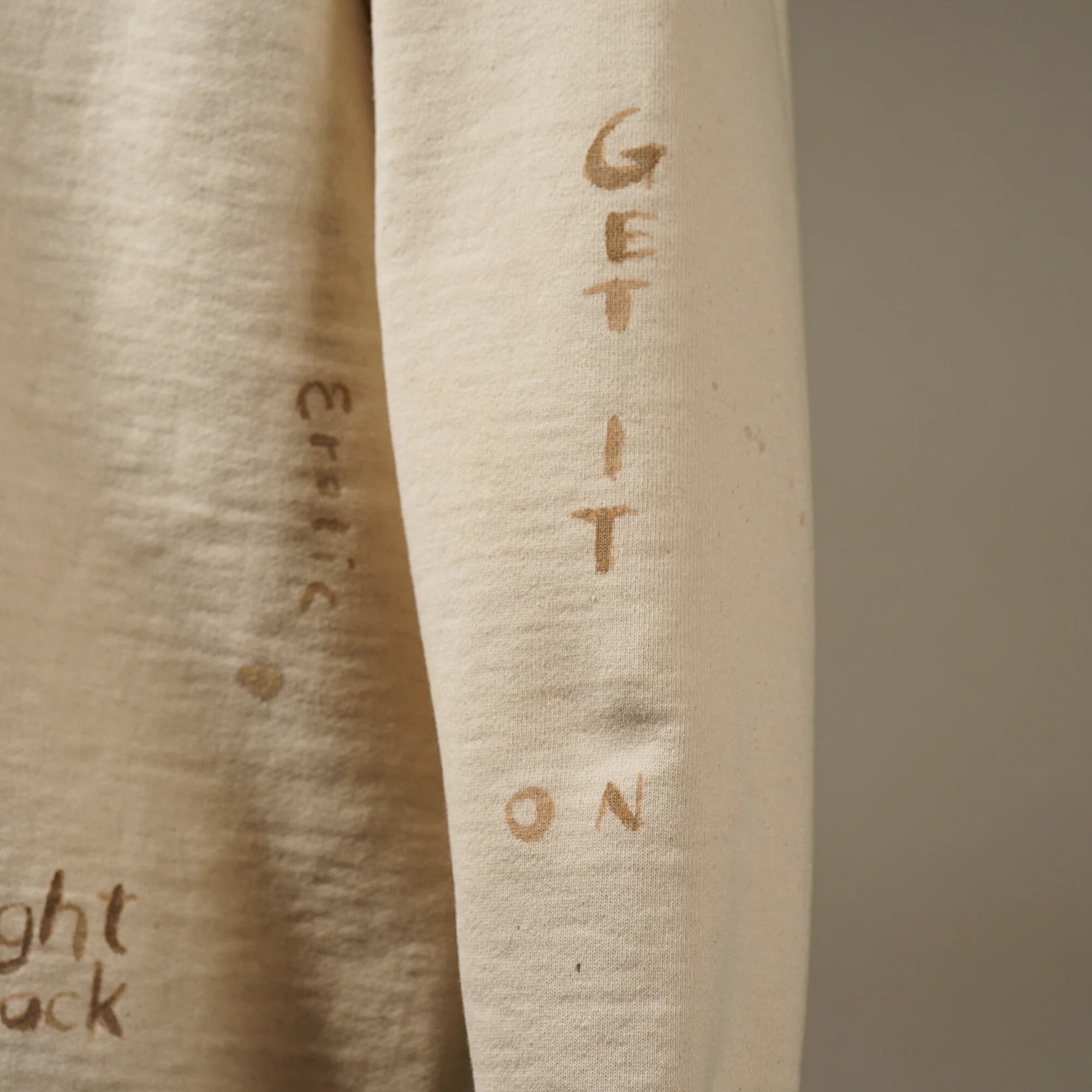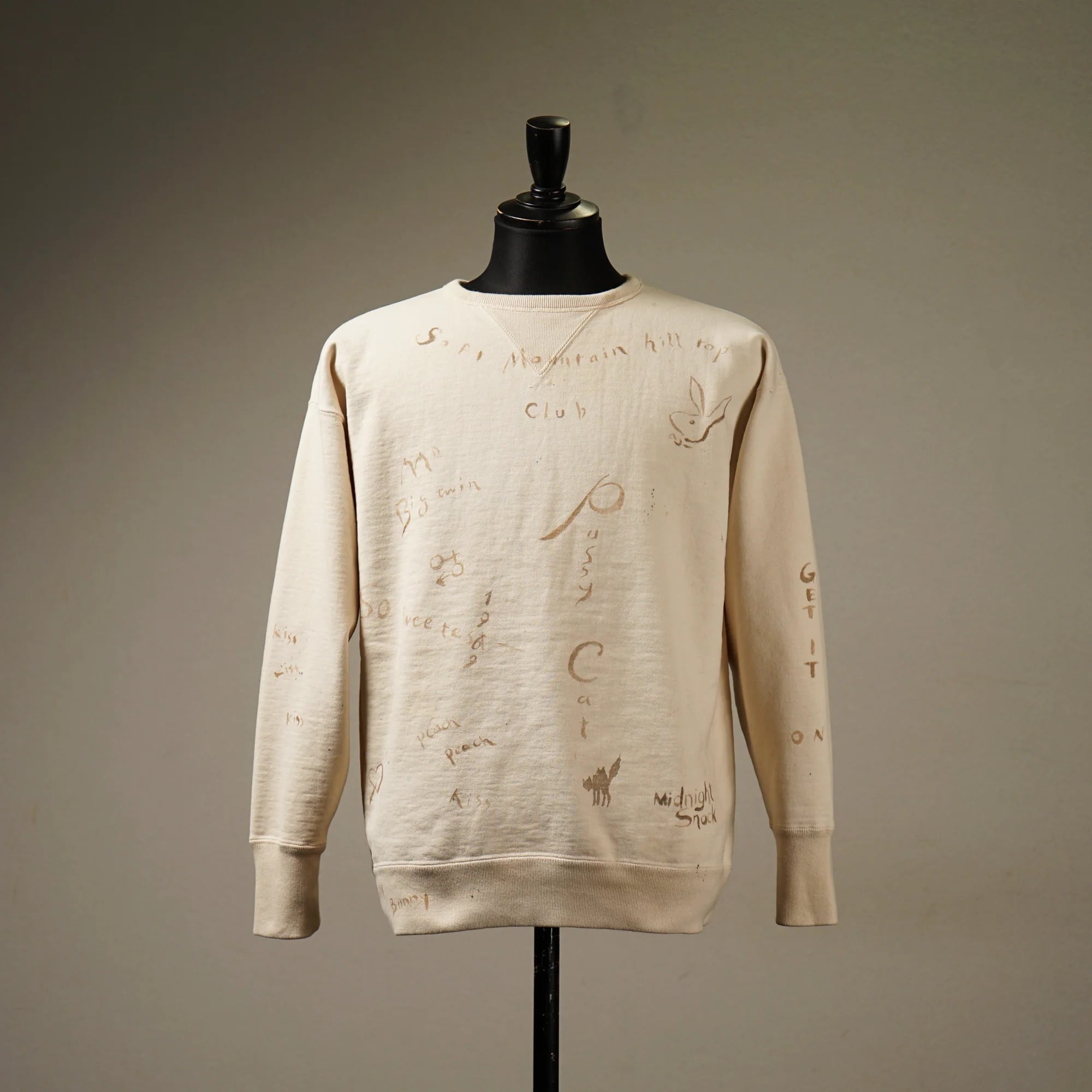 裏糸には大変強弱の激しい粗野で太番手のものを使用し通常よりテンションをかけ、希少な丸胴使用の編み機で編んだ素材に手間のかかる丸胴起毛を施しました。