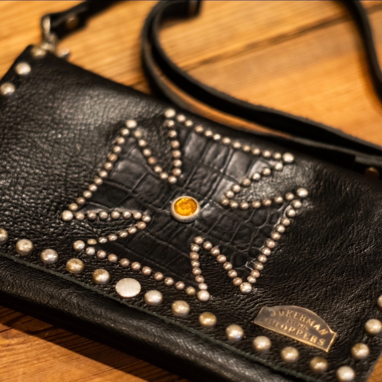 オリジナルエンブレムとスタッズでアインクロスを施したレザーサコッシュとなっております。肩紐は調整可能となっております。