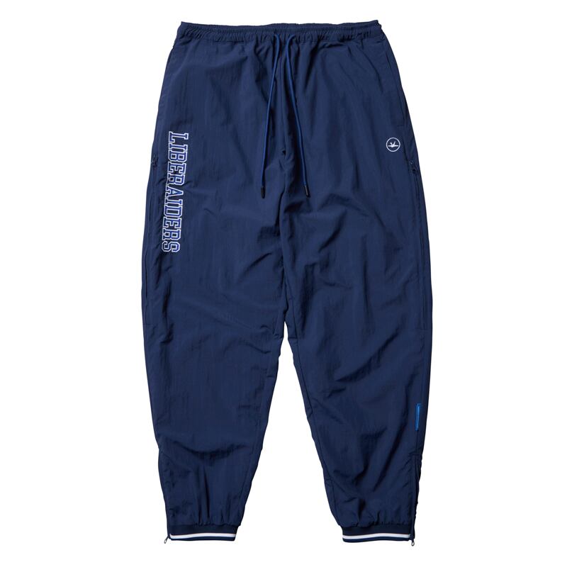 右腿にLiberaidersのカレッジロゴ刺繍、左腿には折り鶴ロゴ刺繍が入ります。